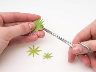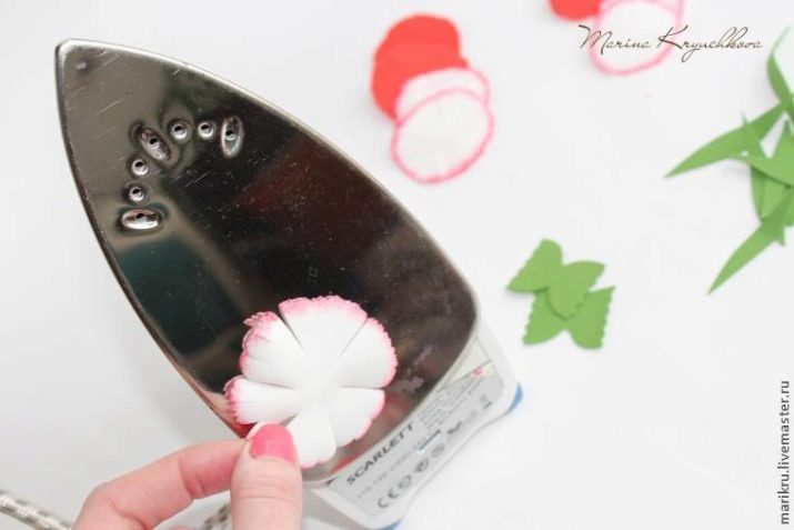 - Quan es preparen els buits necessaris per a un treball addicional, caldrà escalfar-los amb cura sobre una planxa. Doblegueu els elements retallats, desplaceu-los entre els dits diverses vegades. El desplaçament no cal fer-ho amb excés de zel: actuar amb més cura. Només haureu de "reanimar" els pètals de les manualitats futures. El mètode anterior requerirà processar cadascun dels pètals de la futura decoració artificial. A continuació, sobre la planxa cal escalfar les fulles dels grans. Dobreu-les abans que tinguin temps de refredar-se.