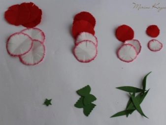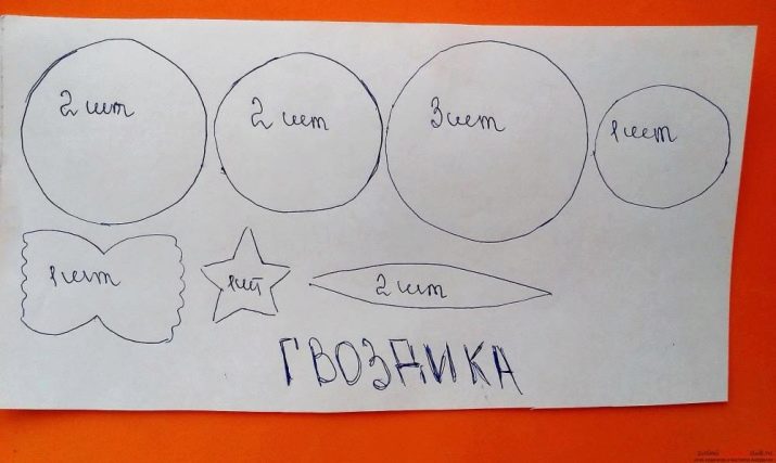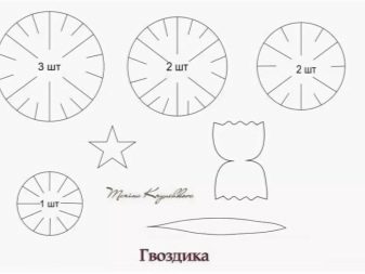 - Primer, caldrà preparar un patró de futurs pètals de clau. Per fer-ho, dibuixeu cercles amb un diàmetre de 5,5 cm, 5 cm, 4,5 cm, 3,3 cm Si voleu, podeu fer grans patrons, sobretot si voleu fer flors de creixement en el futur, tot depèn dels vostres desitjos. A continuació, talleu els cercles de la mida adequada el més acuradament possible. El seu nombre hauria de correspondre amb els valors indicats al full amb patrons. Provem a fer flors de colors vermells i blancs.
