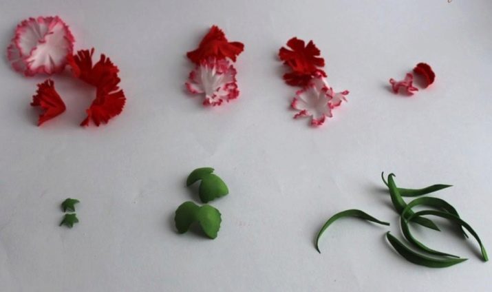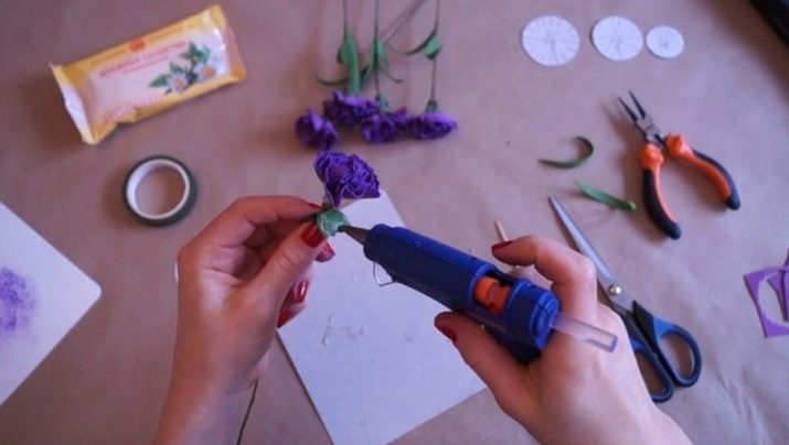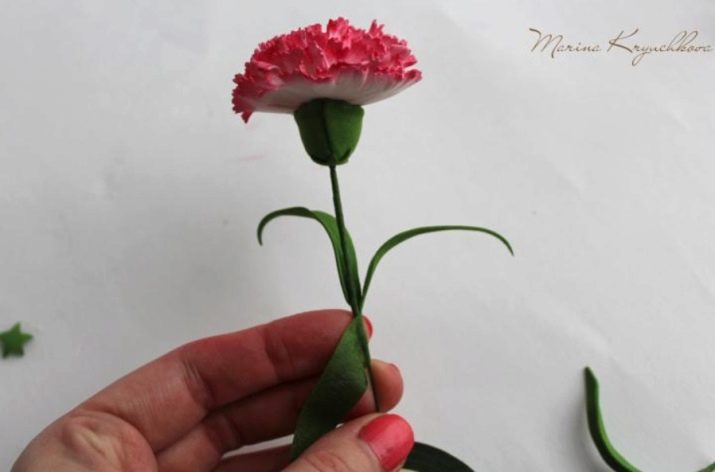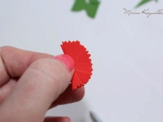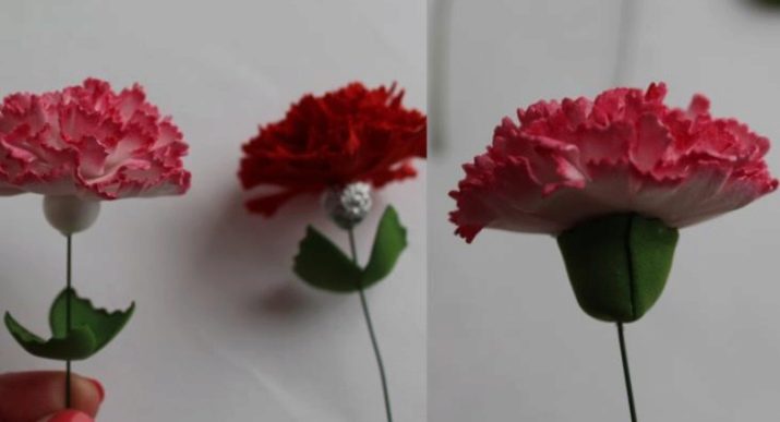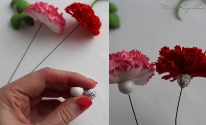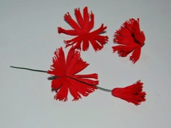 - Arrodoneix la punta del fil especial utilitzat en floristeria. En aquest cas, és recomanable gotejar una mica de cola i, després, enganxar la part més petita de l’estructura. Fixeu-lo de la manera més ajustada i segura possible perquè la base del fil no es noti i no quedi tapada. De la mateixa manera, haurà de colar tots els pètals restants del clavell. Haureu de fer-ho d’acord amb l’ordre del seu augment. El resultat són flors netes. Si inicialment volíeu obtenir manualitats planes de foamiran, en aquesta fase és molt possible aturar-vos.