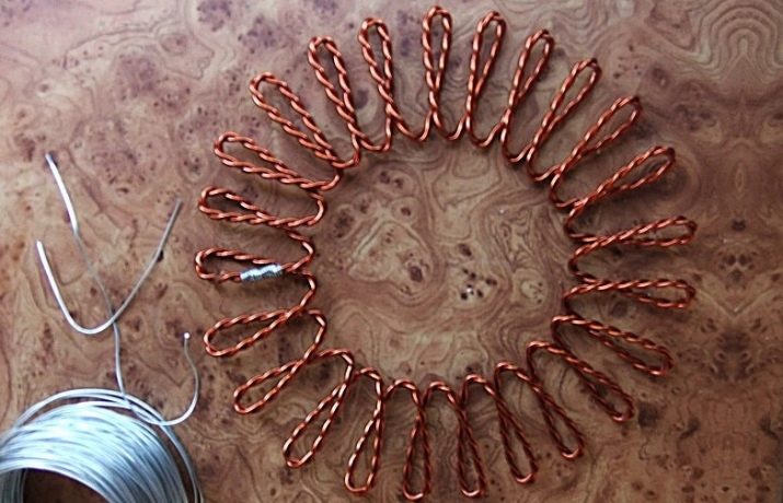 De gruix es pot aplicar un fil gruixut, mentre que els fils prims s’han de torçar els uns als altres per formar una espiral. A més, caldrà un rang prou ampli de longituds adequades. Primer, el filferro s’embolica al voltant de la regla i, després, la peça es doblega de manera que els anells comencin a mirar en diferents direccions. Si tot es fa correctament, haureu d'obtenir una mena de sol, amb els extrems fixats.