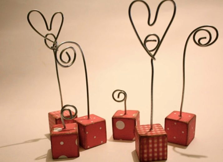 Un cor fet de filferro, muntat sobre un cub de fusta, sembla molt bonic. Primer, el metall està doblat per formar la forma desitjada. A la base, el fil ha de ser retorçat, i després fer el cor doble. L’extrem de la peça es fixa a la part inferior de manera que quedi la cama. Es perfora un forat en un cub de fusta, després s'hi aboca cola i s'insereix una embarcació de coure.