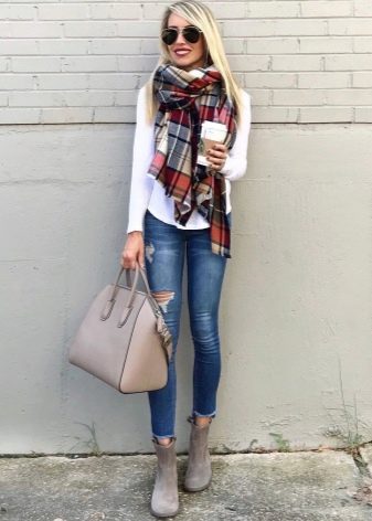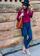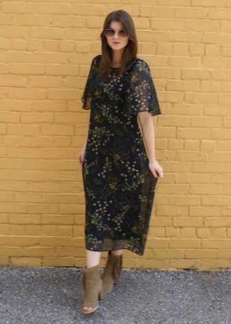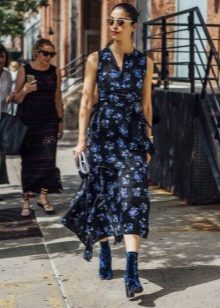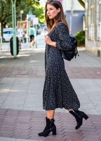 - La camussa és un material únic adequat per a productes de cuir, així com denim o fins i tot seda. No tingueu por de les combinacions originals i atrevides. Per exemple, un vestit midi de seda o chiffon amb botes de turmell de taló baix.
