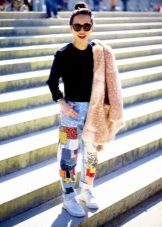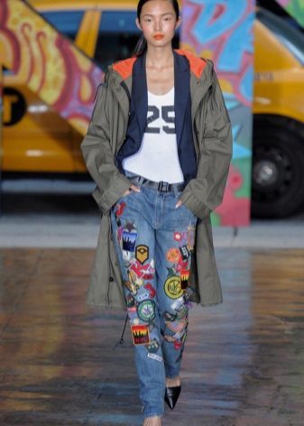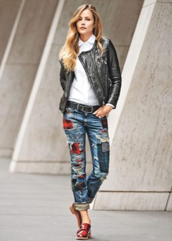 Si decidiu realitzar l'aplicació vosaltres mateixos, podeu utilitzar diferents materials. Combina eficaçment texans i cuir. Podeu aplicar comptes, trenes, botons decoratius o només teixits de diferents textures. L’abast de la vostra imaginació no és limitat.