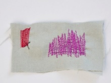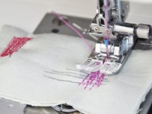 A la part frontal “martellem” el forat amb puntades. La primera puntada avança, després posa la màquina en mode invers i posa la puntada següent. L’amplada entre les puntes és igual a l’amplada del fil. Resulta una superfície densa de fils que semblen pintar un forat.