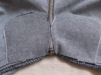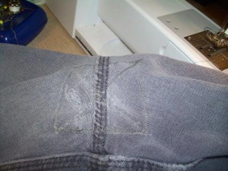 Al mateix temps, hi ha un punt important: és convenient posar la costura, de manera que hauràs d’estirar els texans al llarg de la costura lateral exterior del costat equivocat uns 20 cm. El forat serà, doncs, exactament al centre de la part oberta.