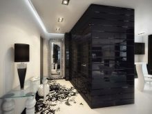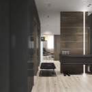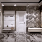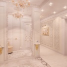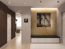 - Si el metratge d’aquesta part de l’apartament no us permet “passejar”, la tasca inicial serà ampliar l’espai visualment. Els tons foscos en la decoració de les parets no són desitjables, els sostres falsos també són inadequats i els grans canelobres. Una opció guanyadora és un sòl fabricat amb materials naturals d’alta resistència (com ara gres porcellànic) i parets lleugeres.