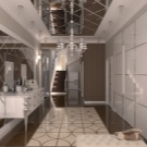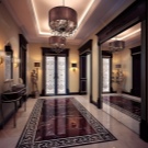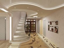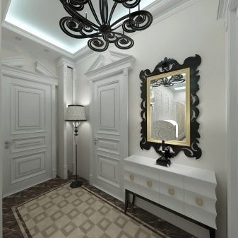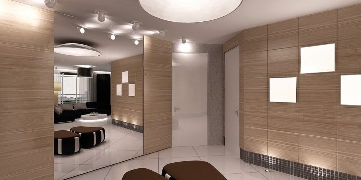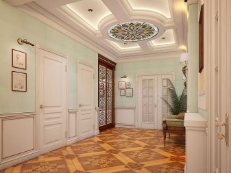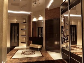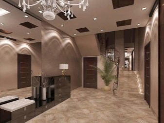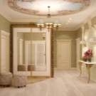 I també el sostre es pot fer de plaques de mirall, però tenir cura no és tan senzill. Es poden utilitzar sostres modulars en suspensió, i aquesta és una opció pràctica. El sostre de placa de guix no és dolent, però per a un vestíbul petit i baix aquest disseny no s’ajusta. Una opció entre els més populars són els sostres d'estiraments. Però hi ha reclamacions, en particular, la facilitat no ambiental.