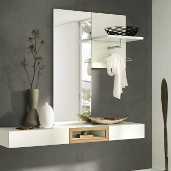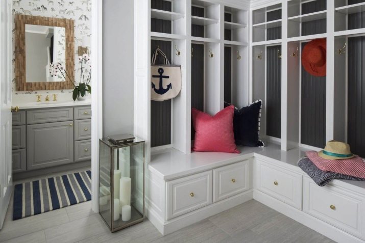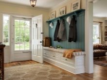 - Gris acollidor i refrescant blanc. El rebedor no està realitzat en colors vius, però no té un aspecte estricte i contenut. Una gran solució per a un petit passadís quadrat. No hi ha armaris massius, però hi ha molts ganxos per a la roba exterior, i uns amplis armaris inferiors amagaran tot el que necessiteu.