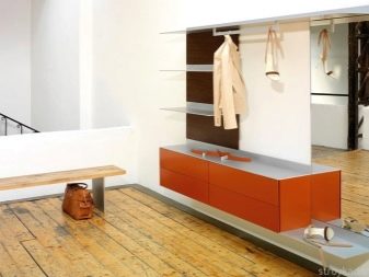 - Es poden suspendre els prestatges i els cofres (fins i tot la sabata). Aquests dissenys de 10-30 cm no arriben al sòl. Semblaria una petita diferència, però els mobles que no toquen el sòl semblen menys molestos, cosa important per a un petit passadís.