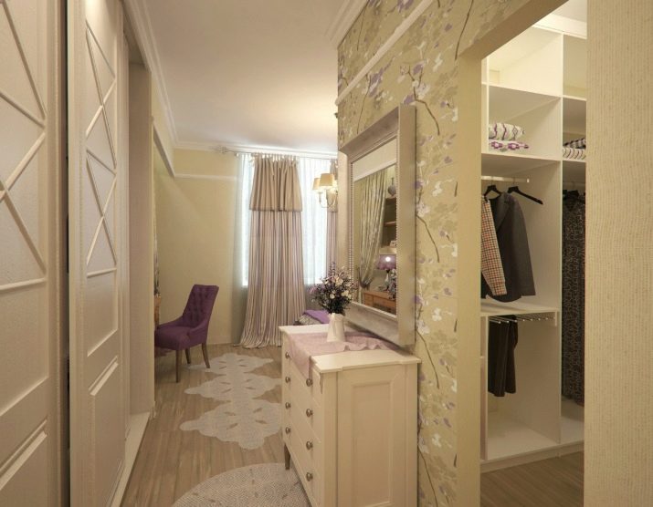 - Si teniu un disseny no normal i hi ha un vestidor just al passadís, aquesta decisió pot convertir-se en una directriu. Un estret cofre i un disseny lacònic distreuen l’atenció de la modesta mida de l’habitació.