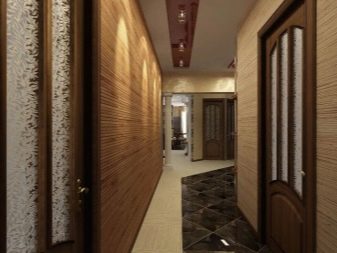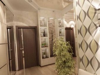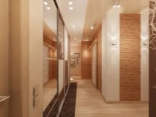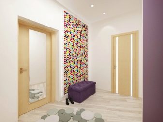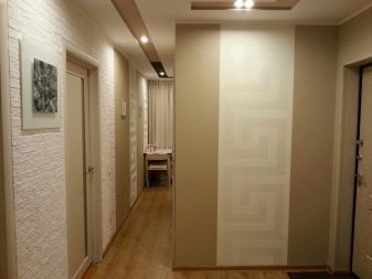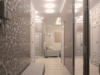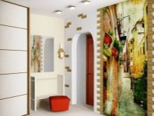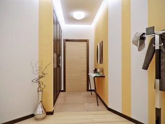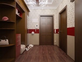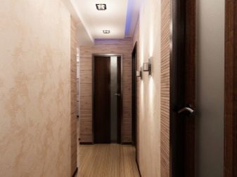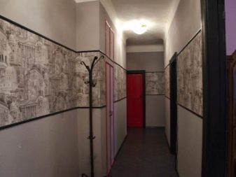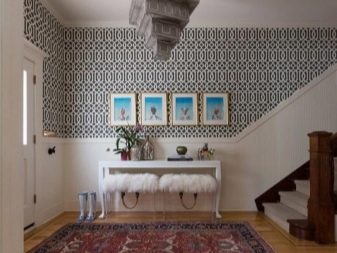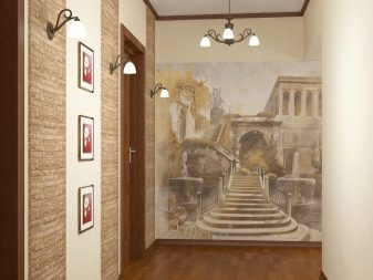 Si el passadís té una forma allargada i és prou estret, els murals o lones amb brillantor no seran una bona idea. Quan la llum s’encén, aquests materials la reflecteixen molt bé. Si no hi ha prou espai, doncs sembla molt desordenat, en conseqüència, és millor evitar aquesta combinació. Es pot col·locar fons de pantalla tant verticalment com horitzontal, i els materials es poden enganxar a la paret a la meitat o en proporcions diferents.