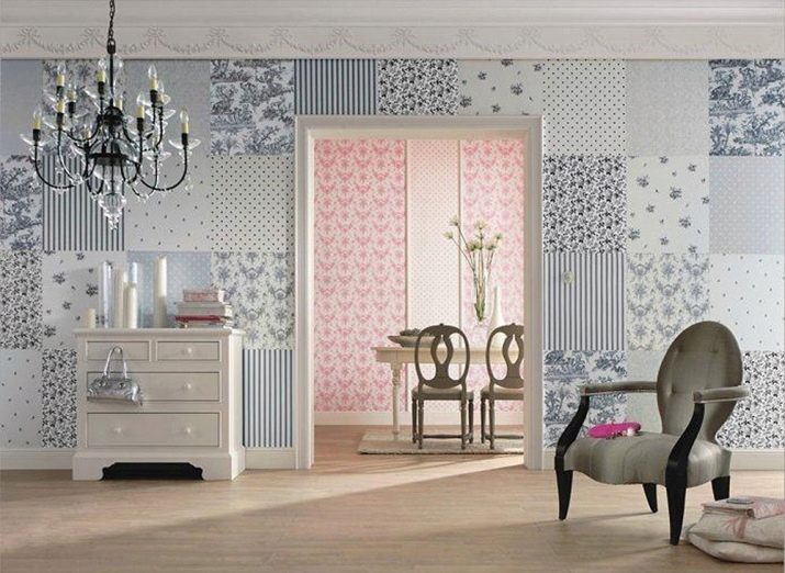 Per a un disseny així, hi ha una tècnica especial. Porta el nom de patchwork. La conclusió és que la base s'omple de solapes de paper pintat, diferents en el disseny i l'esquema de colors. Les combinacions poden ser d'allò més inusuals, tot depèn de la imaginació de l'intèrpret. En alguns casos, ni tan sols podeu acabar les juntes.