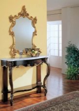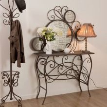 La taula es pot situar a prop del banquet o sota el mirall. Les taules de forja de la sala d'estar són de mida petita, cosa que és suficient per a una bossa de mà, guants, perfums o claus preferits.