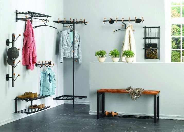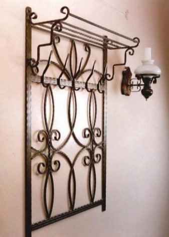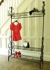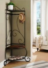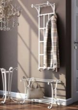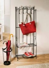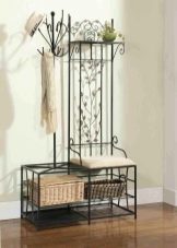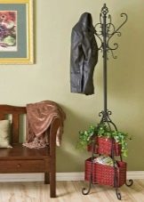Models de sòls requereixen més espai, per tant, només són adequades per a habitacions grans. Però semblen sòlids i poden convertir-se fàcilment en l’element principal de l’interior. Aquests penjadors tenen la forma d'una barra, sobre la qual es disposen els ganxos en diverses files. Els ganxos superiors estan dissenyats per a barrets. Als ganxos inferiors és convenient col·locar bosses, paraigües o roba infantil. Els penjadors de sòl forjat sovint estan equipats amb cistelles o paraigües de vímet.