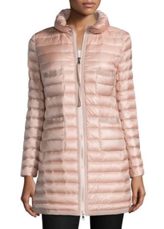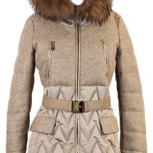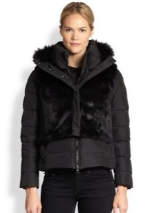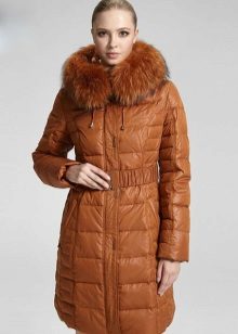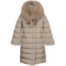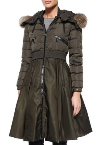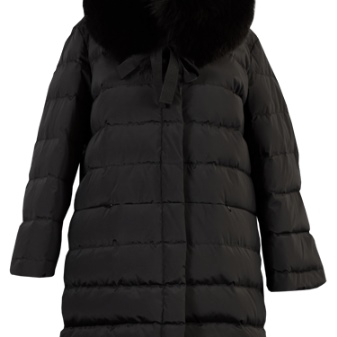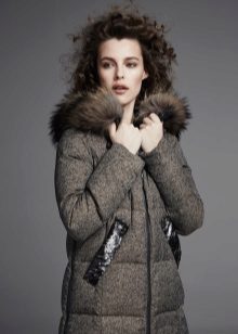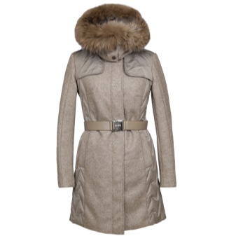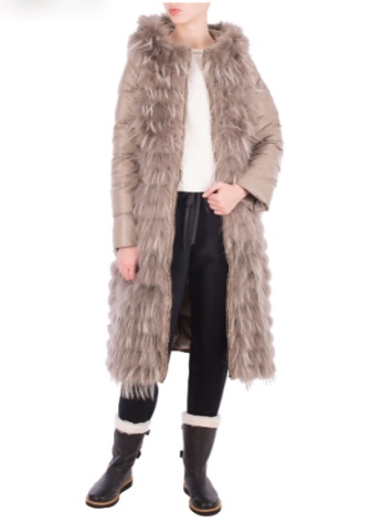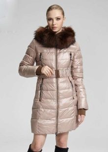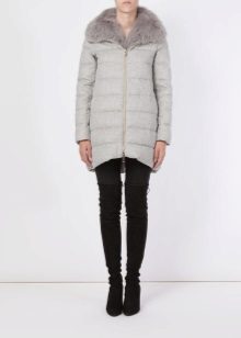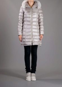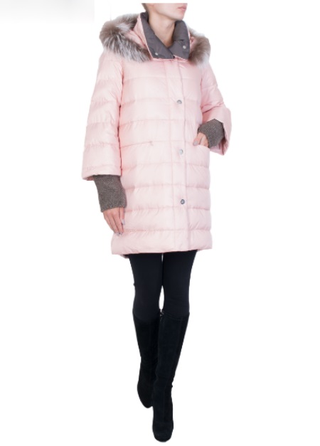 2. La jaqueta de Fontanelli amb un bonic color rosat suau és molt còmoda per la silueta trapezoïdal i una bona longitud fins a la meitat de la cuixa. La caputxa desmuntable es retalla amb pell de guineu, les mànigues retallades s’aïllen amb insercions de punt.