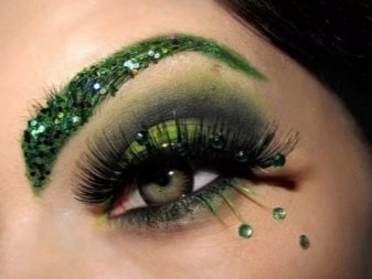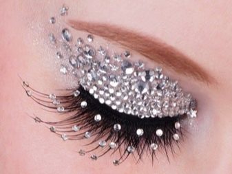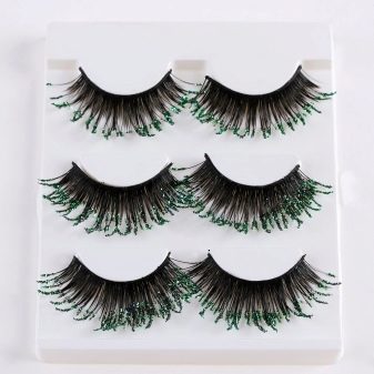 - Si teniu una sessió fotogràfica o una festa, podeu prendre llarges i exuberants pestanyes de cinta d’una forma i un color inusuals. Articles adequats amb joies addicionals (en el maquillatge quotidià no són adequats).