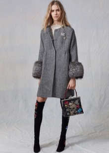 - Una faldilla estricta, un abric i unes botes modernes, però estrictes, crearan un llaç adequat per al treball d'oficina. Les millors variacions del color són els tons de marró i gris.