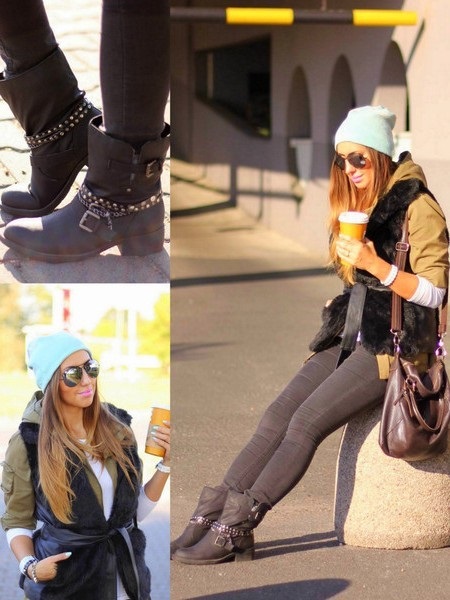 - La simbiosi de les botes de turmell fetes amb colors foscos saturats (gris, beix, marró, negre) amb faldilles, vestits midi i samarretes dels mateixos colors és adequada per a una reunió romàntica amb un home. El seu aspecte serà femení, modest i elegant.