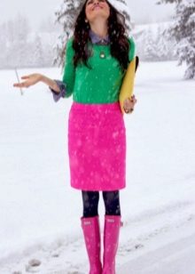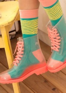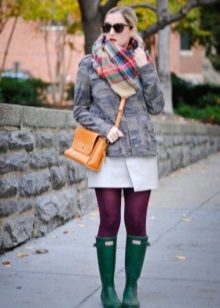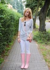Amb les botes de goma és molt possible portar una falda o un vestit, mentre que amb vestits curts, combini sabates de taló i, amb vestits llargs, opcions en plataforma o sola plana. Al mateix temps, trieu els pantalons ben clars o de colors, segons els colors de les sabates.