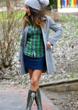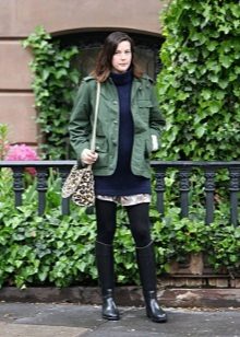 Aspecte urbà molt elegant. El seu element més destacat és un vestit curt d'estil folk. Aquestes peces de roba es complementen amb un lleuger vent de color beix fosc i unes calces d’un matís de moda de “mocha”. Els detalls de moda del conjunt són una bufanda de gran volum de punt i unes botes de goma negre en una sola plana, potes adequades al màxim. Les sabates tenen una decoració discreta en forma de sivella en miniatura i un logotip blanc. La bossa de la bossa groga serveix d’accent brillant d’aquesta imatge juvenil.