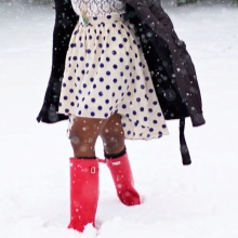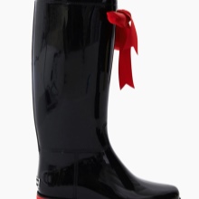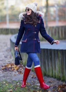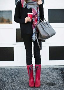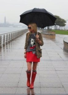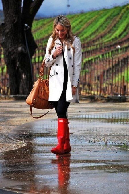 Les botes de goma vermell brillant amb una bota lleugerament rebaixada s’ajusten perfectament a un conjunt de moda de tardor. Els pantalons ajustats de color negre s’introdueixen a les botes, un elegant impermeable blanc de neu amb decoració negra actua com a roba interior. Els colors blanc i vermell estan garantits per animar-vos en temps de pluja. Aquest vestit positiu es completa amb una voluminosa bossa que coincideix amb l’ombra dels cabells d’un fashionista.