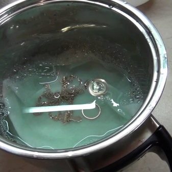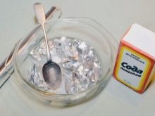 Segur que tota mestressa de la casa hi trobarà bicarbonat. També es pot utilitzar per guardar la cadena, el penjoll o la polsera preferits. Per netejar el metall, cal bullir aigua, afegir-hi soda en una proporció de 50 g per litre d’aigua, després d’això s’emboliquen les joies d’argent en paper film i se submergeix en una solució bullent durant un quart d’hora. A continuació, només cal rentar els productes i assecar-los.