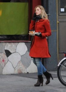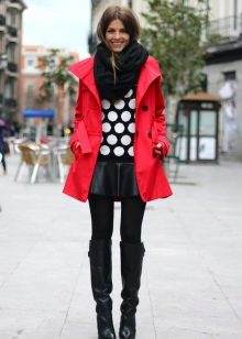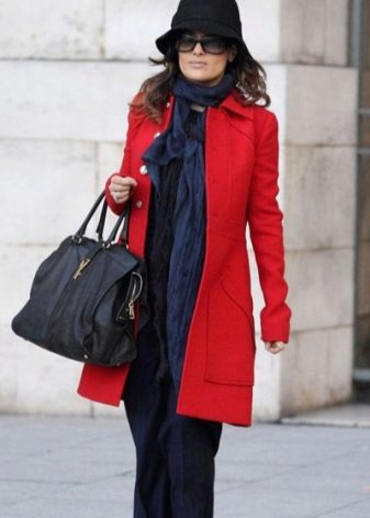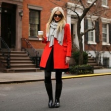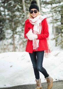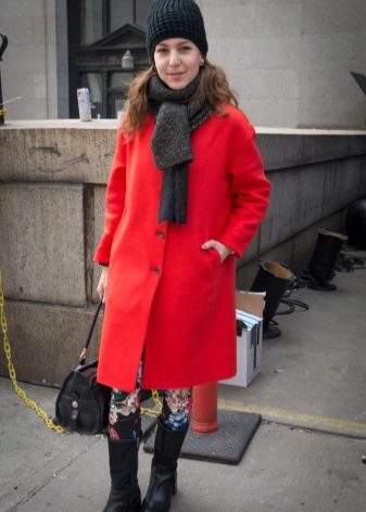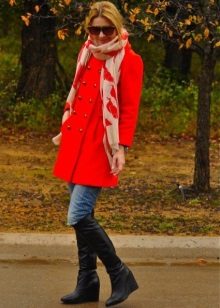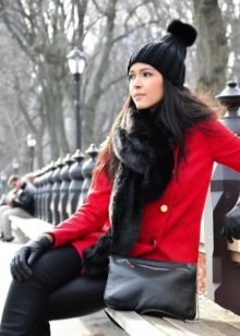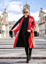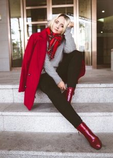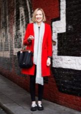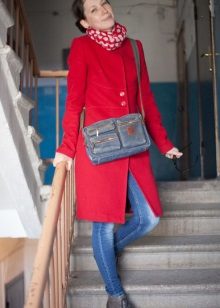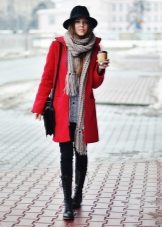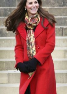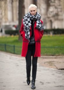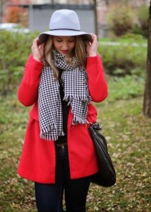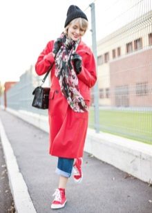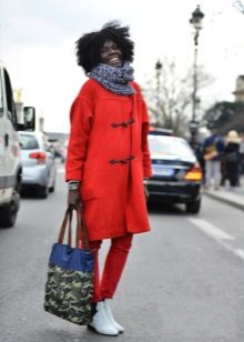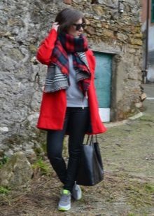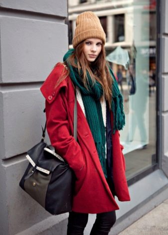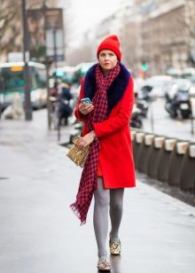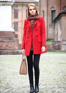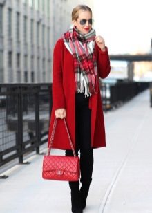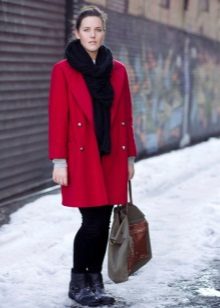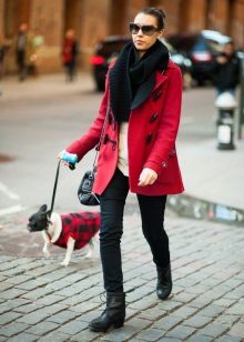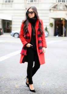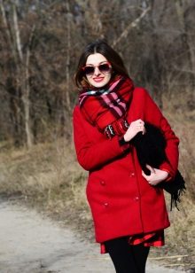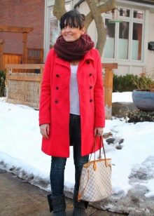 És bo complementar un abric vermell d’un estil esportiu amb un mocador de punt: pot ser un collarí o un mocador llarg normal, preferiblement negre. També serà adequat un mocador de moda elevat amb cremallera o botons.