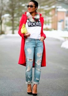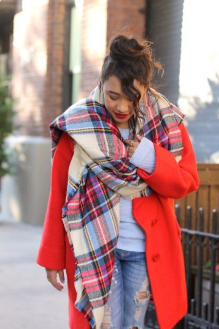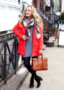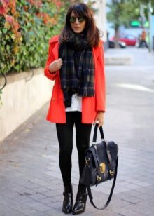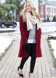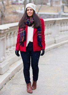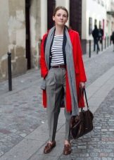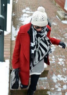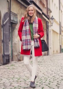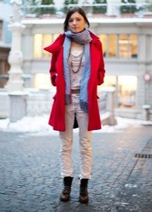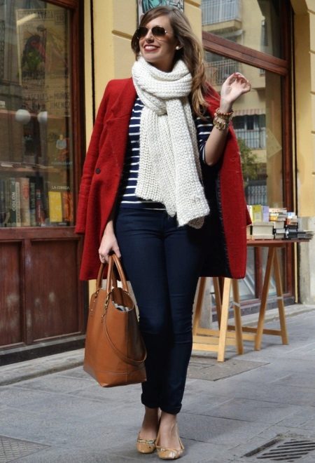 El component principal d’aquest conjunt és, per descomptat, una voluminosa bufanda de teixit d’un color blanc de neu. Aquest element elegant, portat amb un abric vermell desfet, refresca l’aspecte i li aporta una nota positiva i alegre. El vermell i el blanc sempre són una combinació guanyadora, la resta de peces també són ben escollides: uns pantalons blaus foscos ajustats i una brusa ratllada amb una ratlla blava i blanca. El color d’una gran bossa de cuir es combina amb un matís de sabates.