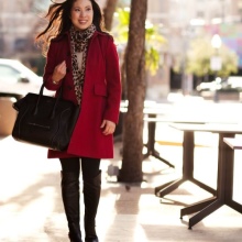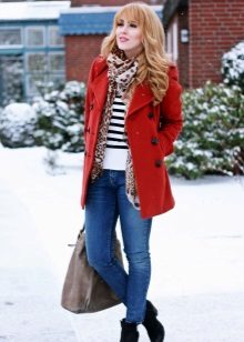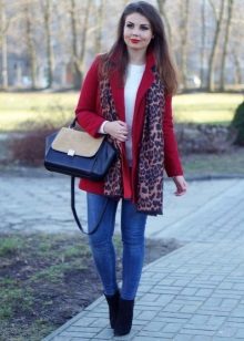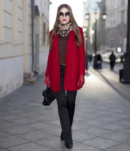 Elegant abric roig d'estil clàssic complementa una bufanda fina amb estampat de lleopard. L’accessori està ben drapat al voltant del coll, les seves puntes estan ocultes. El mocador es combina de color amb un coll de color marró i l'únic botó d'un abric escurçat coincideix amb el color amb els pantalons d'un tall clàssic. Guants de pell vermella, una bossa de negre i unes sabates del mateix color complementen el look. L'ensemble està en harmonia amb el color dels cabells llargs de la noia, i l'ombra del pintallavis s'ajusta al color de l'abric.