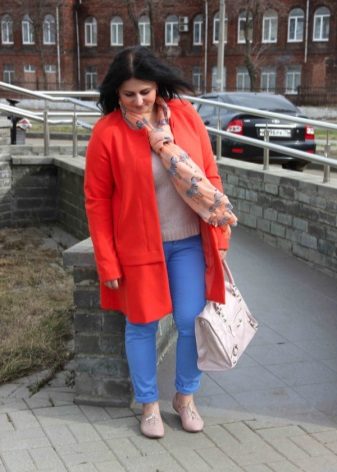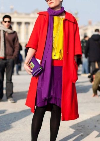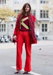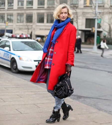Els amants dels experiments de moda es poden oferir per combinar un abric vermell amb un mocador blau. Simplement, no usis texans per evitar passar a la borda amb tonalitats blaves.