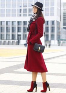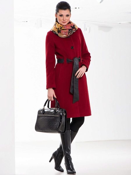 Aspecte de moda i atractiu. Un abric d'una rica tonalità burgundia és un estil elegant en si mateix: una longitud midi a la moda, una petita bengala de la cintura i un aspecte destacat del model són un cinturó de pell de pell negra molt contrastat. Un mocador amb una estampada floral brillant sobre fons negre afegeix un conjunt elegant. L’accessori està fabricat amb un teixit prim que es retola molt bé al coll. La resta de peces de roba estan fetes de color negre, que desprèn l’ombra de l’abric i es combina amb un cinturó i uns botons: es tracta de polaines, botes altes de pell amb talons i una bonica bossa brillant.