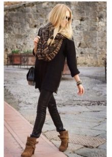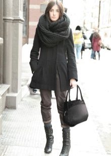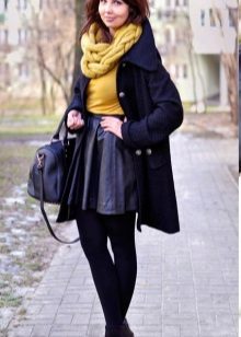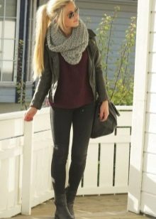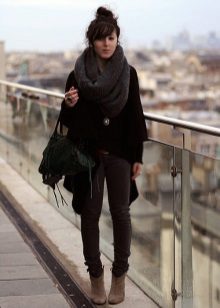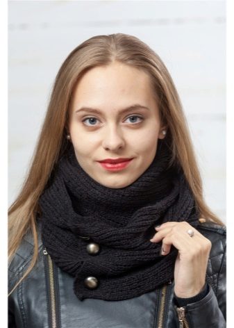 La primera imatge és una combinació clàssica de snud negre amb un conjunt femení. La noia porta una falda curta, una jaqueta de cuir elegant i negra i un jersei de punt. Naturalment, volia aïllar el kit, ja que l’acció té lloc clarament a la tardor o a la primavera. En aquest cas, la pinça realitza dues funcions alhora: realment protegeix del fred i, a més, complementa el vestit, fent ressò una mica del patró de la jaqueta.