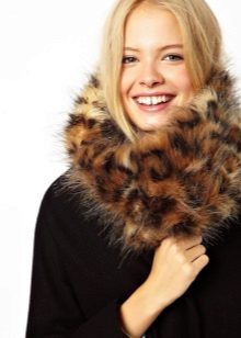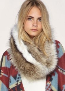 - Una bufanda de vuit figures amb pells es pot portar com a xal si és suficient. Aquesta opció és força adequada per a un esdeveniment festiu, quan una noia vol tapar-se les espatlles nues amb un vestit. Es proposa tirar un bucle al coll i baixar-lo suaument cap avall sense deformar el material. De vegades és difícil col·locar la pinça de forma bonica, de manera que podeu utilitzar l’ajuda d’un satèl·lit.