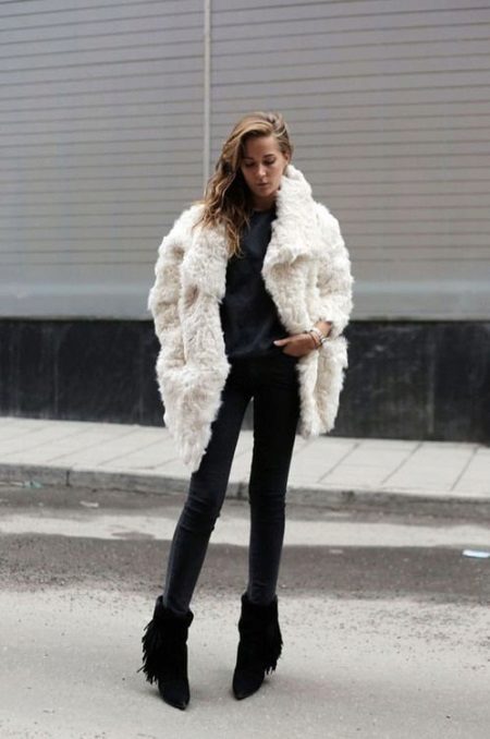Una altra opció és només sortir. Qualsevol celebració a la nit us permetrà posar-vos un mantell i semblar adequat al mateix temps. Aquí, a diferència del cas amb l’estil comercial, la pell elegant conviu harmònicament amb decoracions enganxoses i un vestit brillant.