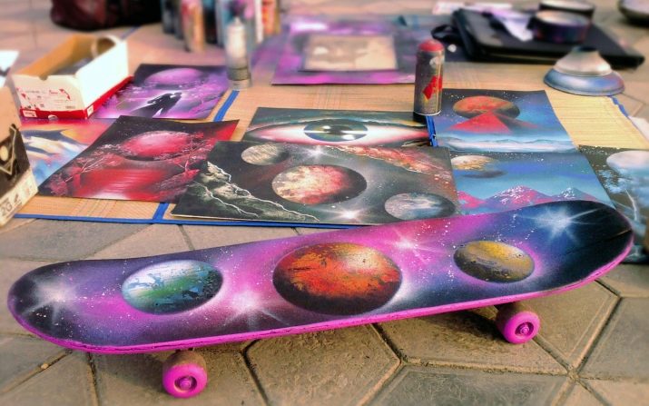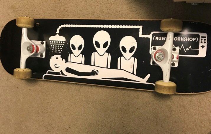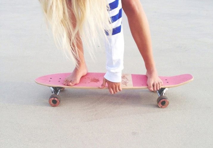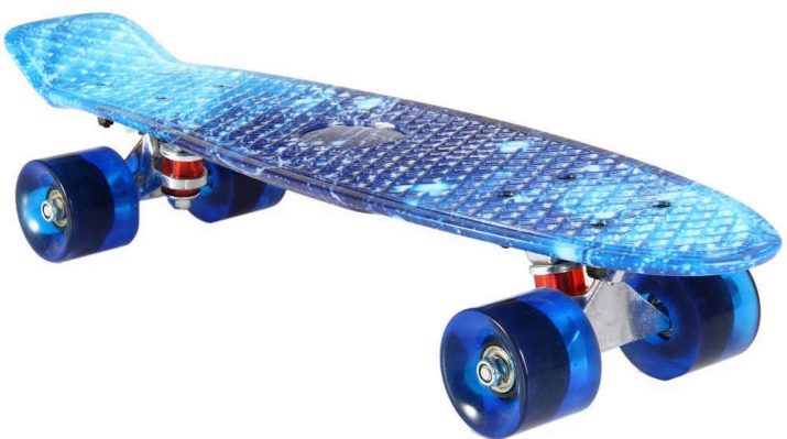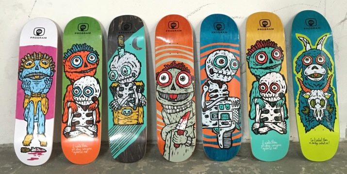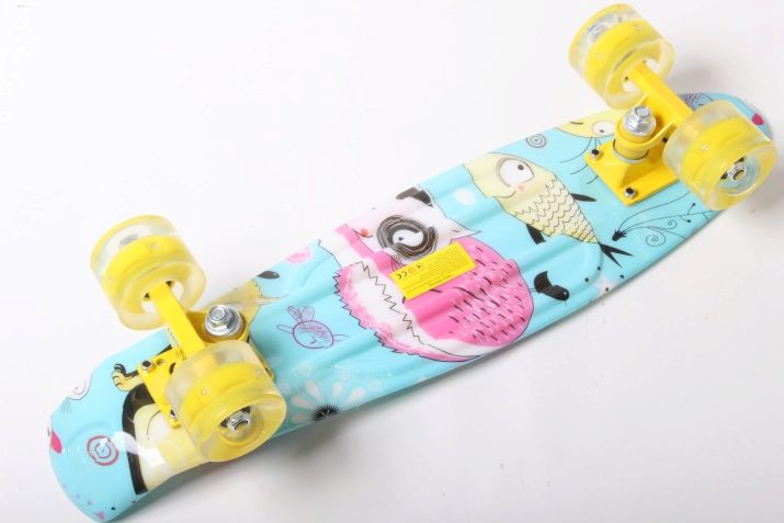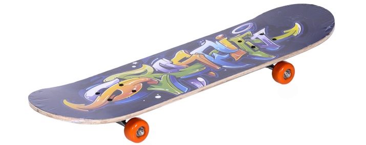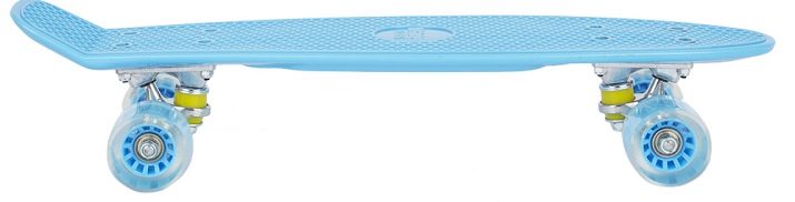 La imaginació del comprador no es limita a res. Per exemple, podeu comprar un patí clàssic morat amb serigrafia neta, un model retro brillant o una plataforma urbana, la coberta està pintada de manera que es pugui veure l'estructura de l'arbre utilitzat.