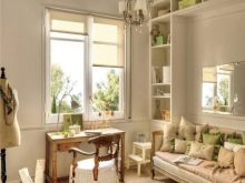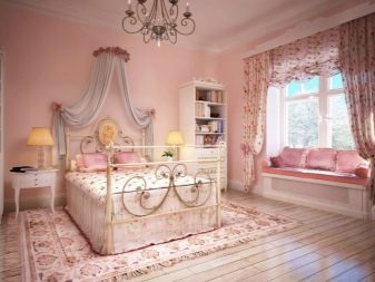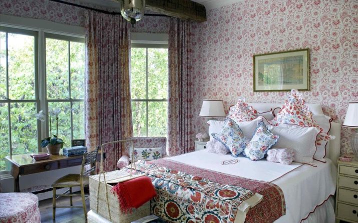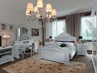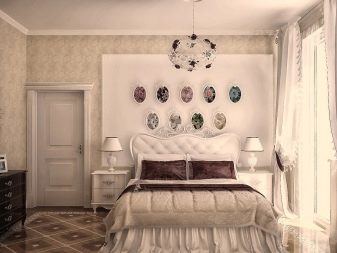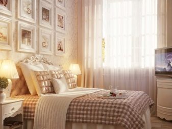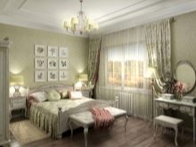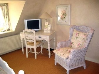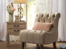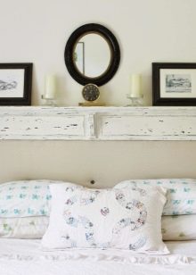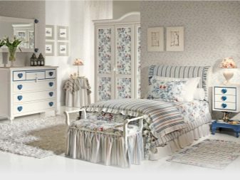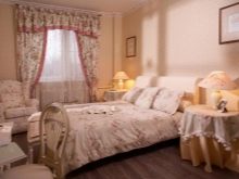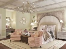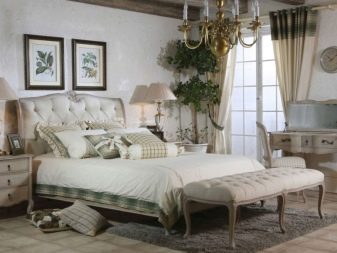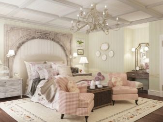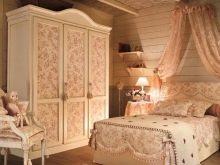 A la part superior del cofre es pot col·locar un petit mirall, una foto emmarcada i un modest ram de flors de prat. Podeu decorar l’espai amb petites figuretes de formes no gaire complexes. Un element auxiliar interessant de l’arranjament pot ser una tauleta de cama en cames tallades o corbes. Les butaques del dormitori es poden decorar amb petits coixins tipus sofà.