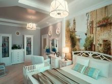 Una excel·lent solució pot ser decorar part de la paret de l’accent amb fons de pantalla fotogràfic. Atès que l’estil considera el paisatge de fora de la finestra una continuació de l’habitació, una de les parets es pot dissenyar amb una imatge realista d’un carrer antic francès. Tot i que no hi ha cap obertura de finestra al dormitori, aquest paper fotol és una bona solució per aportar l’espai visual i l’estat d’ànim necessari a l’habitació, que podreu crear tu mateix sense implicar reparadors.