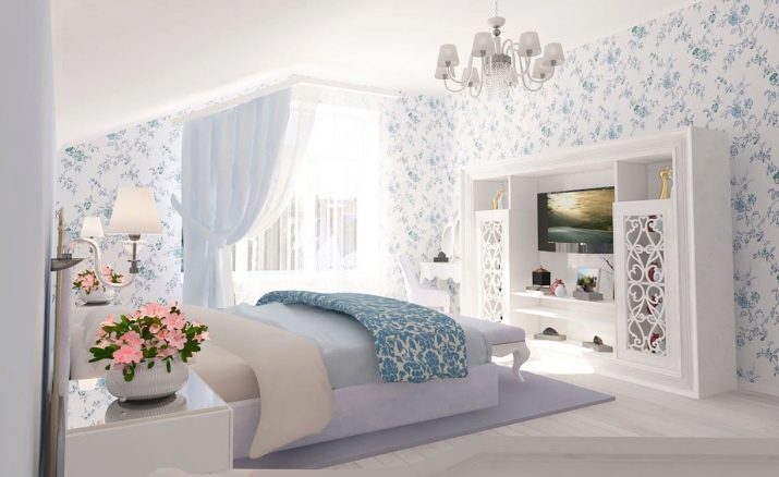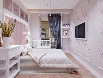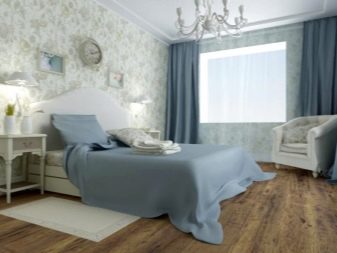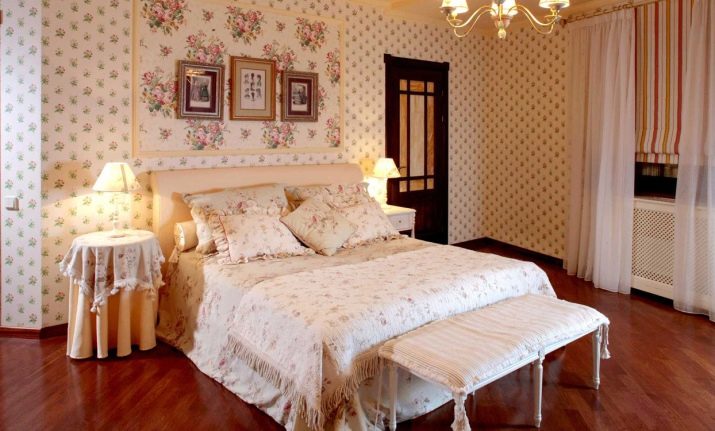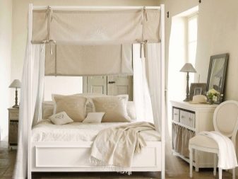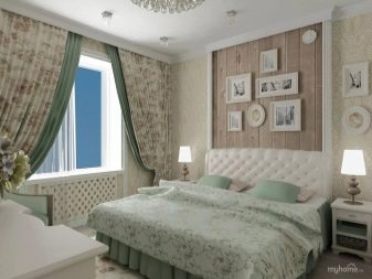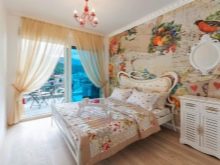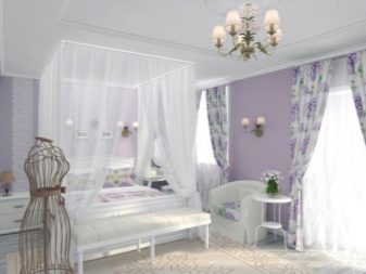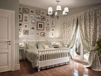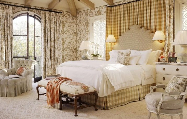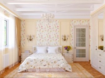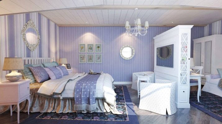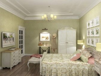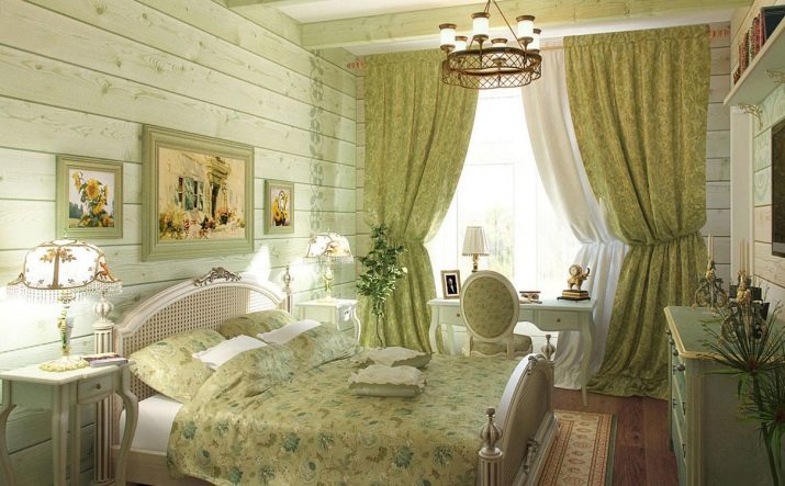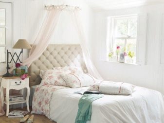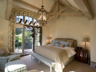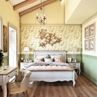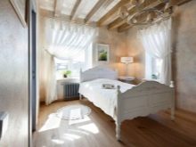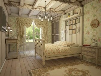 El mateix rellotge electrònic o la luxosa catifa descarada destruirà immediatament la integritat del fons interior, trencant l’atmosfera que hi predomina. La situació en aquest dormitori hauria de ser simple, com una casa rural. Tanmateix, alhora està saturat de sofisticació i certa aristocràcia. El dormitori d'estil provençal es diferencia d'altres elements d'estil per elements claucom la presència de bigues de sostre, mobles de fusta antics, així com rams de flors de prat en gerros lacònics.