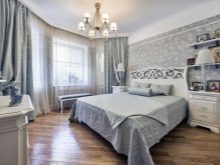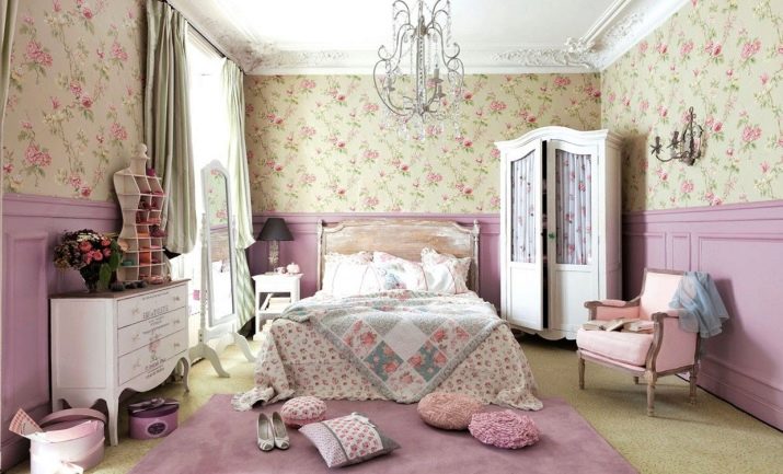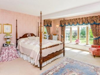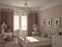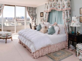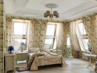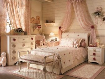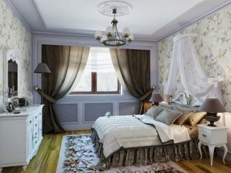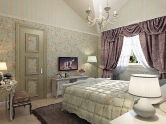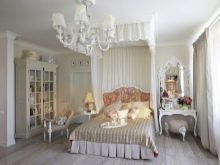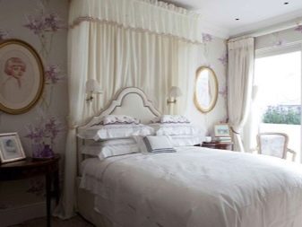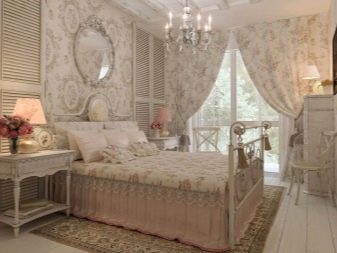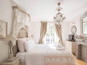 En un dormitori així, tot hauria d’estar saturat de l’esperit de l’antiga era. Això s’aplica a articles per a la llar, mobles, la seva forma, color i fins i tot el mètode d’ubicació. Es tracta necessàriament de tèxtils naturals amb estampats florals, colors clars de l’interiorisme, presència de cofres, caixes antigues i demostració de monogrames familiars.
