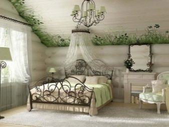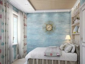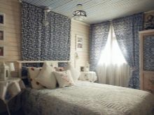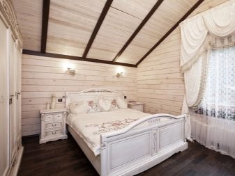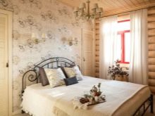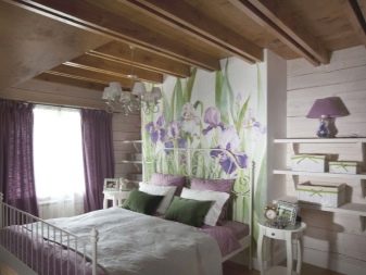 Tot i que els materials principals en el disseny de l’habitació són la fusta i la pedra, la llista d’acabats per a parets, sòls i sostres no és tan escassa. Per exemple, les parets del dormitori es poden revestir amb panells de paret de fusta, que es poden pintar amb pintura clara per adaptar-se millor a la Provença. Una opció igualment digna per a la decoració de parets pot ser el seu tractament amb guix rugós.