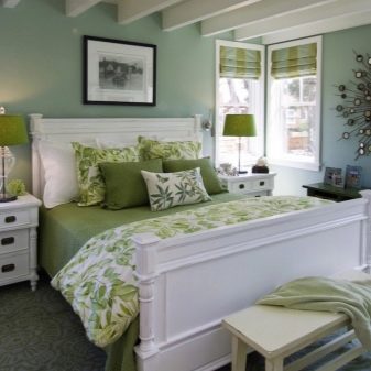 Si el sol del dormitori es dóna al beix, el podeu combinar amb una tonalitat blanquejada de color oliva, blau o pols. D’aquesta manera es crearà l’ambient de la llar al dormitori. La pintura de lavanda a la paleta de colors està en harmonia no només amb el contrast blanc, sinó que pot fer un excel·lent duet amb un toc d'ametlla o vainilla, així com amb el color d'una rosa fumada. No és difícil entendre l’elecció correcta de l’esquema de colors: si els tons s’associen a un ram de flors silvestres, la solució s’escull correctament.