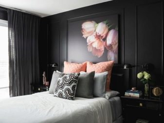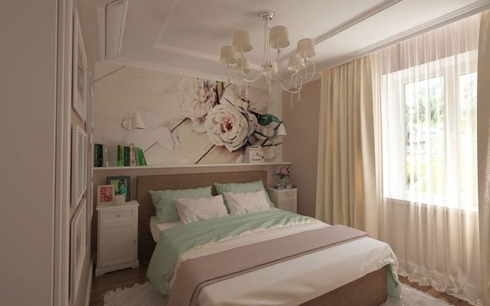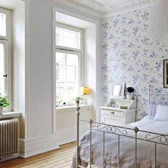 - La decoració de les parets. Tot depèn del gust individual. Després de 50 anys, a moltes dones no els agrada el perfeccionament i el luxe, sinó els motius florals simples en un estil rústic. Per tant, un fons de pantalla lleuger en una flor molt petita, en combinació amb cortines similars i un tul senzill i lleuger, es converteix en una elecció freqüent per a un dormitori.