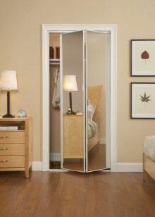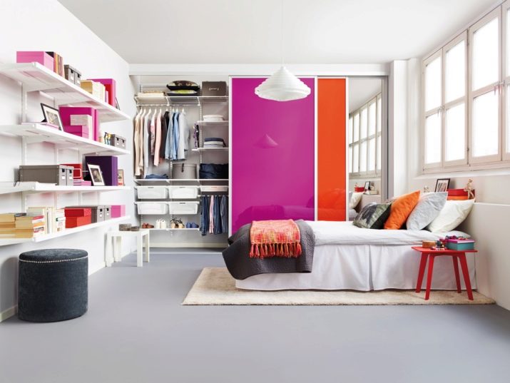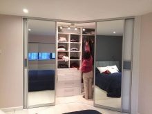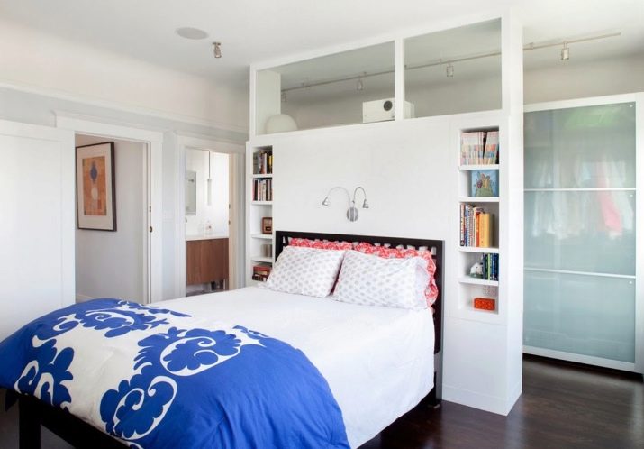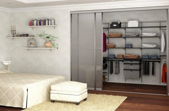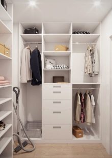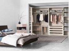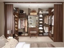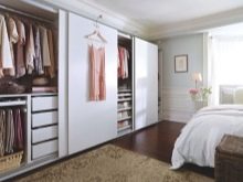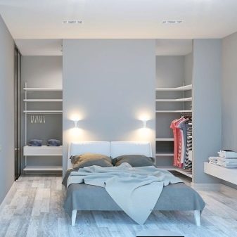 La disposició del vestidor pot no requerir portes, per això, simplement tanca una part del dormitori darrere del llit amb un modern prestatge, posa un armari, miralls, prestatges. També hi ha una partició de tauler de guix, que pot iniciar-se en una de les parets i no arribar a l’altra, de manera que hi ha lloc per a l’entrada i pot assumir dos passos a les dues parets; aleshores la seva part principal estarà al centre.