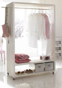 Una opció encara més econòmica al tauler d'espai és un penjador per a mòbils. La barra d'un sol nivell del penjador de la capa es troba a una alçada d'uns 1,5-1,7 metres del terra. Una estació de dos nivells és preferible en termes d’estalvi d’espai - a una barra, situada a 2 metres del terra, pengeu coses llargues, al segon a un metre del terra.