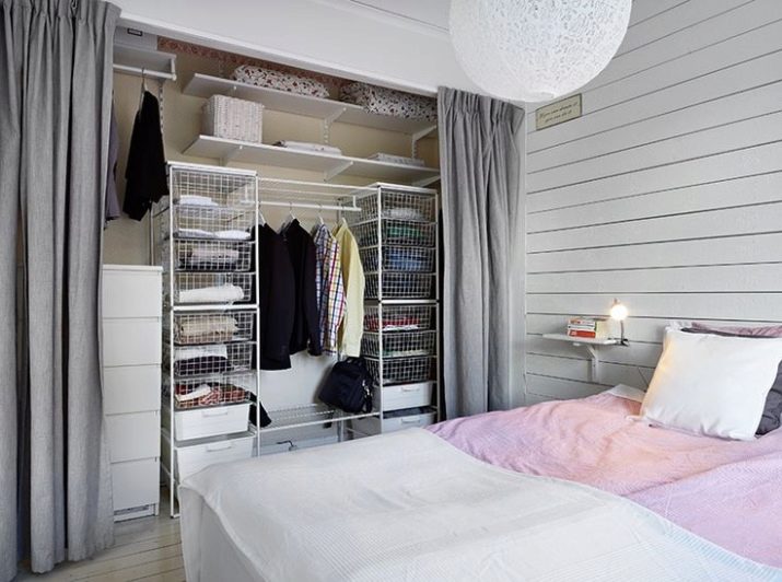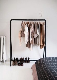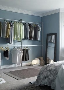 A prop de les barres hi hauria d’haver espai lliure on canviar-se de roba, i es pot separar aquesta habitació de la resta del dormitori amb l’ajuda d’una pantalla. Per descomptat, aquesta opció us oferirà una mica d’espai per a la roba i més encara per a les sabates; per als articles de temporada, encara necessitareu un armari.