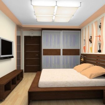 - si l’habitació és gran i té una forma relativament quadrada, aleshores una excel·lent opció és instal·lar un llit al centre d’aquest, i un vestidor –darrere del cap, mentre que l’armari ha de tenir una profunditat d’almenys mig metre i deixar almenys 70 cm d’espai lliure;