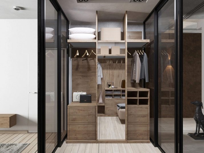 Organitzant les parets del vestidor en forma d’angle recte (com una parada de dutxa), podeu obtenir un resultat excel·lent. El principal és que les portes estiguin equipades amb un fàcil sistema lliscant i no cal aplicar esforços sempre que calgui canviar de roba. L’opció és bona per a apartaments petits.