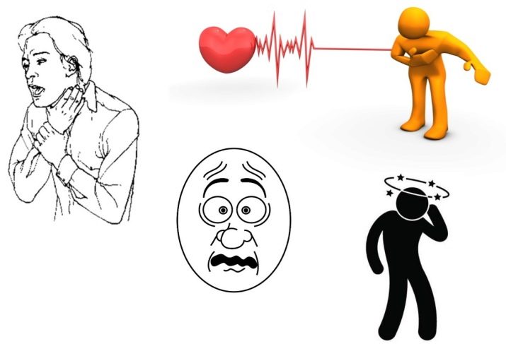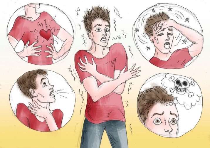 S'asseca a la boca, hi ha sensació de debilitat a les cames i coma a la gola (difícil d'empassar). Les palpitacions cardíaques s’acompanyen de tinnit, que sonen al cap. Molt depèn de les característiques individuals de la personalitat, psique, salut.