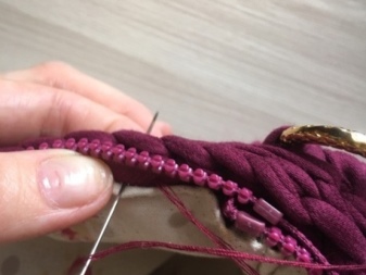 - Introduïu el folre a la bossa i cosiu-lo a la base. Això es pot fer amb una agulla mitjançant puntades de mà. Queda fixar el cinturó a l’espatlla.