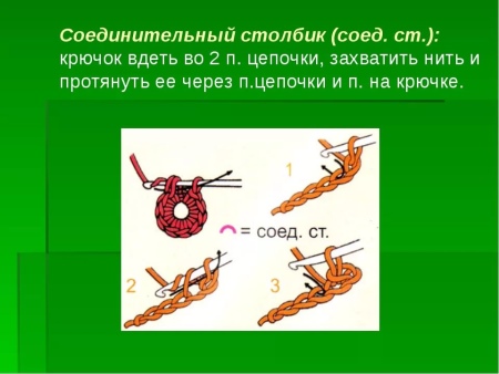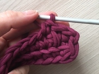- Crochet una cadena de 18 VP. Lligar una cadena PST d'un sol ganxet (un braç de llaç ha de ser lliure). A la vora del punt resultant, feu 3 bucles.